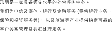 迅羽公司累積了眾多行業豐富的知識和經驗,通過科學的運營管理模式和逐漸完善的執行手段,確保客戶的規劃和策略在呼叫中心服務中能真正得到保障。